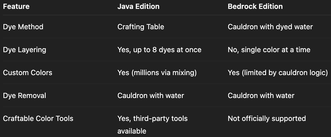 Bedrock Edition handles dyeing differently, using cauldrons and dyed water.