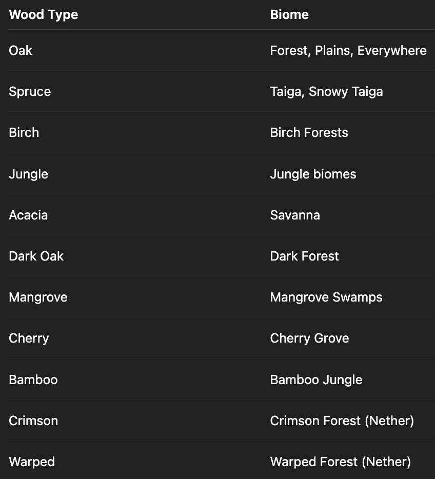 Discover all wood types in Minecraft with this complete 2025 guide. Perfect for builders, with pro tips and biome locations.