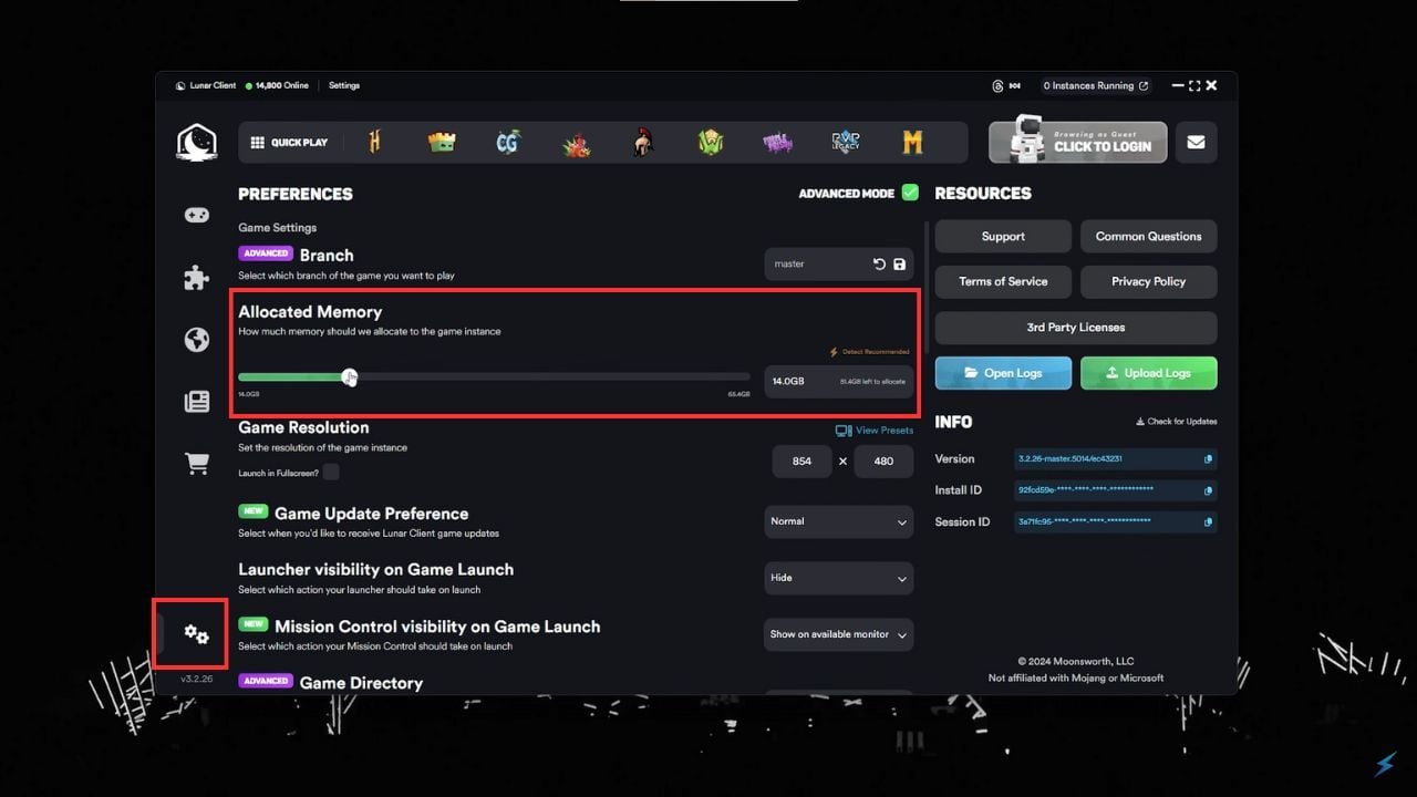Open Settings - In the Lunar Client launcher, click the settings button at the bottom left.