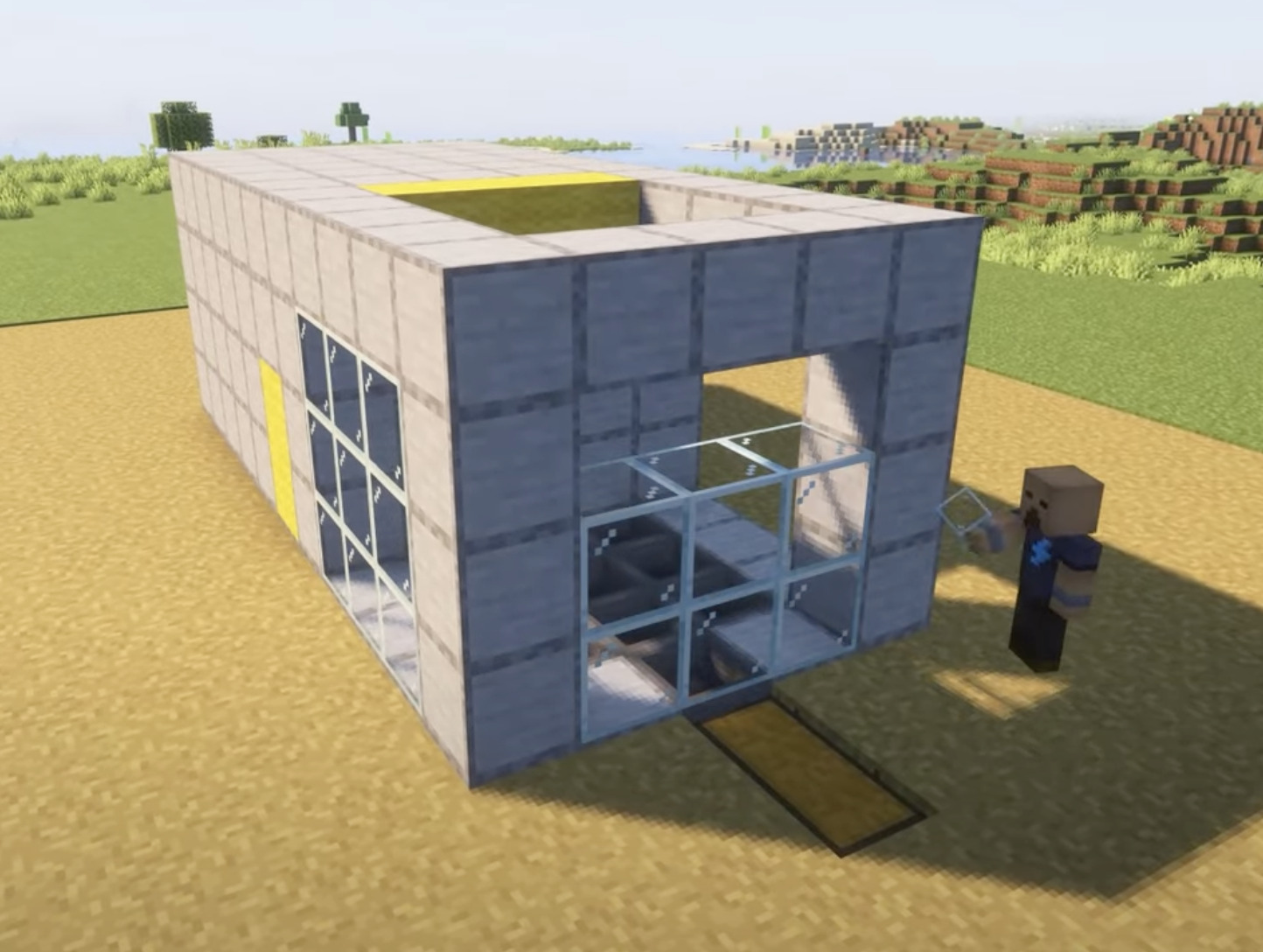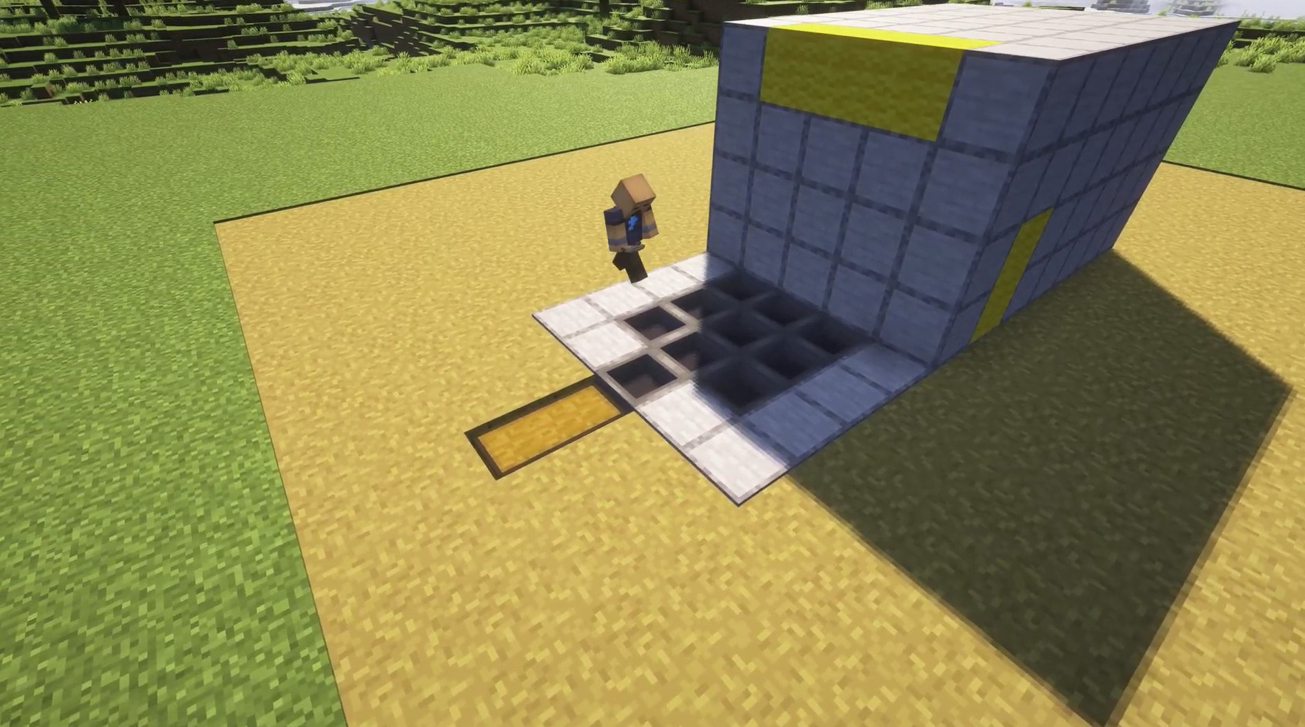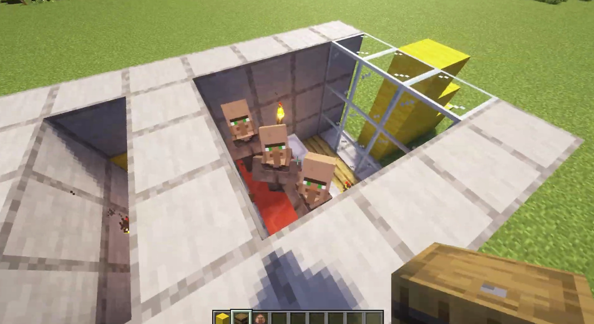 - Dig out a 5x5 square on the back wall of the Villager panic room. (The side with the temp blocks).