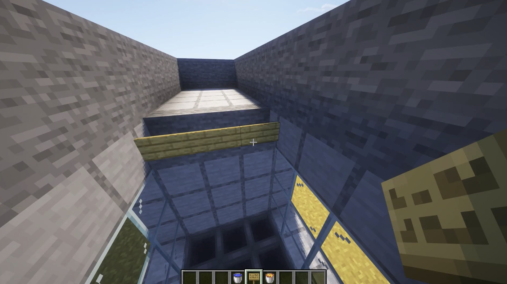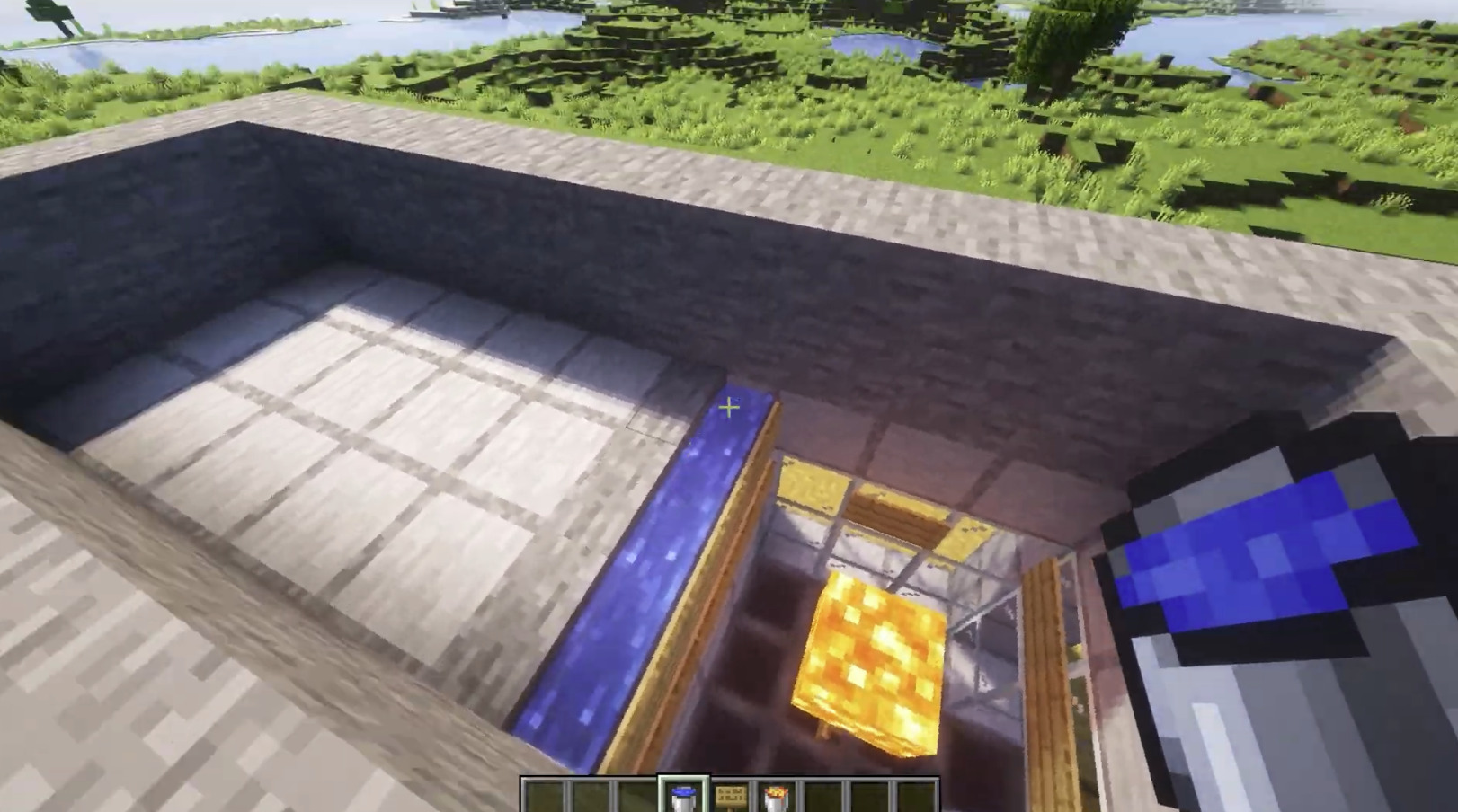 Add water buckets in opposite corners so water flows toward a 2x2 hole in the center.