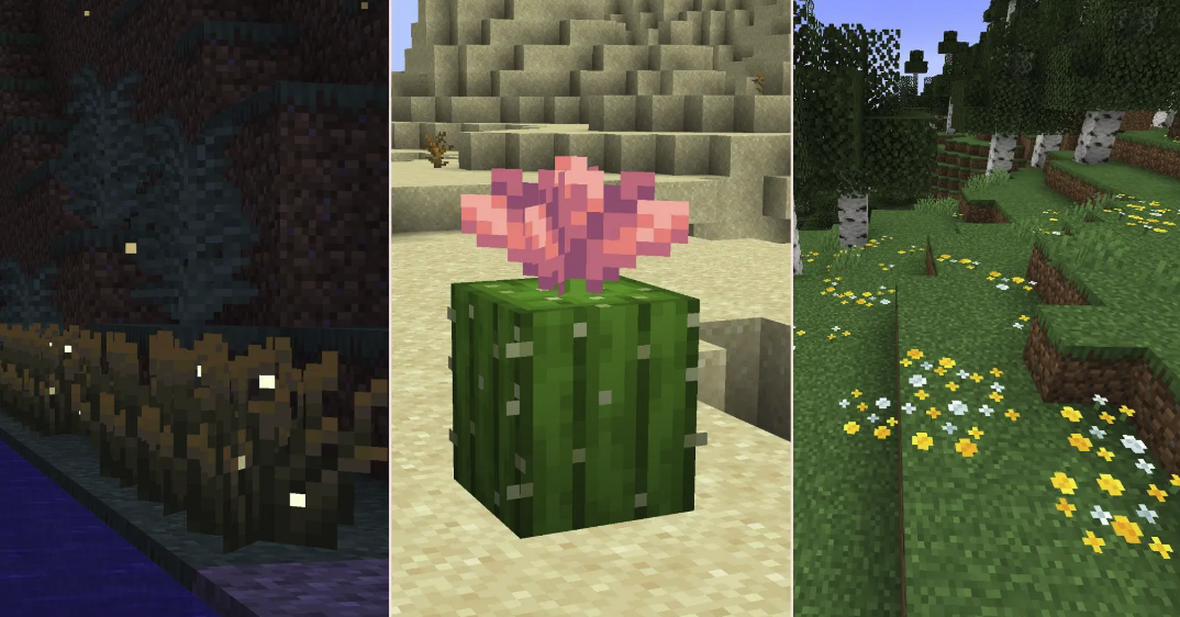 Cactus Flowers: Can grow on cacti with a 10-25% chance depending on cactus height; craftable into pink dye