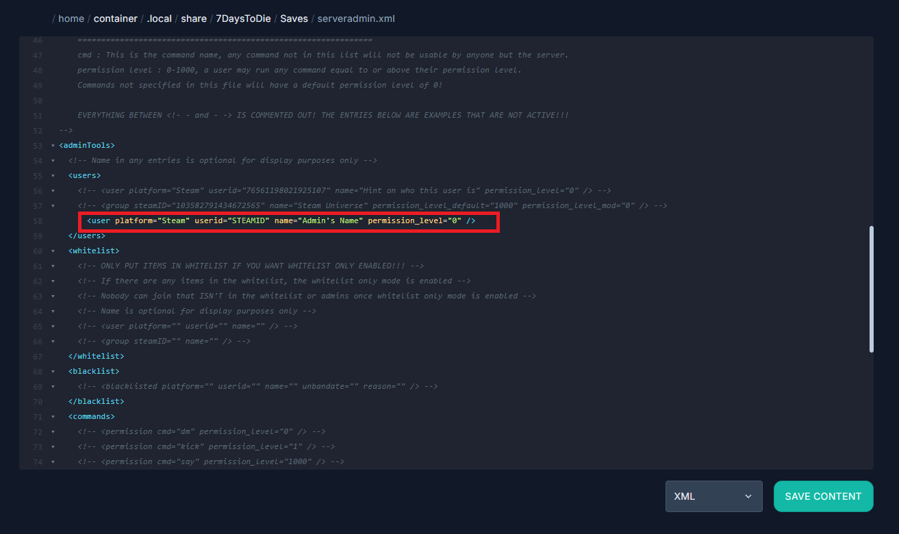 <user platform="Steam" userid="STEAMID" name="Admin's Name" permission_level="0" />