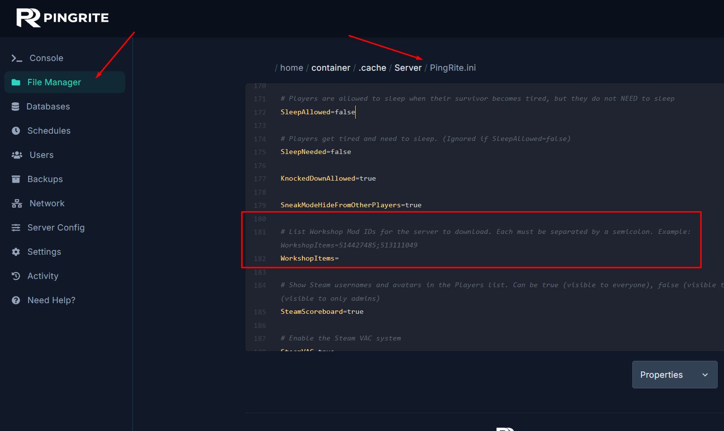 - Go to File Manager tab and navigate to `/.cache/Server/` and open the `.ini` file with your server name.