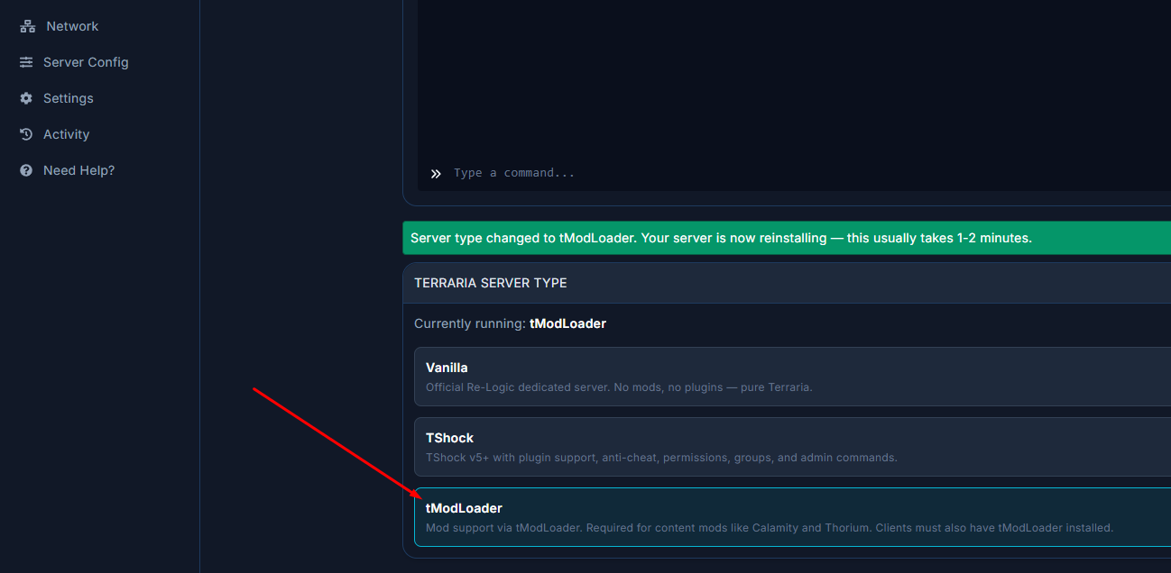 - Click tModLoader on the server type menu under the console.