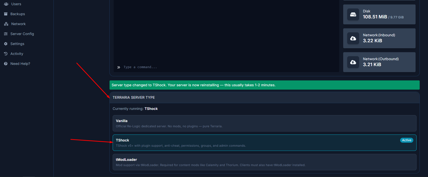 - Select TShock in the mod switcher underneath the console. Read the warning information and confirm the change.